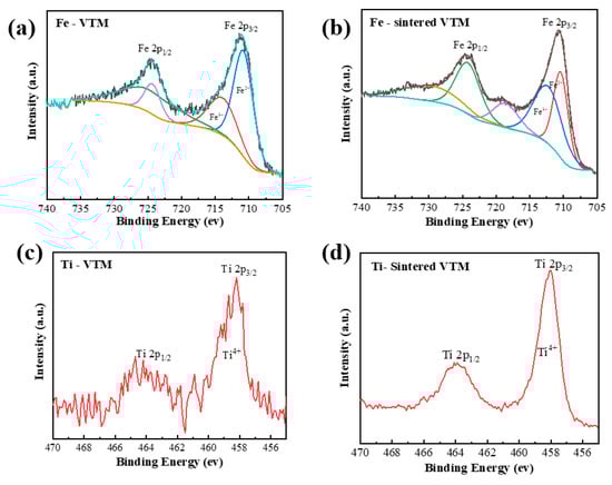 XPS pattern of Fe and Ti in VTM and after oxidation. (a) Fe-VTM, (b) Fe-sintered VTM, (c) Ti-VTM, (d) Ti-sintered VTM.