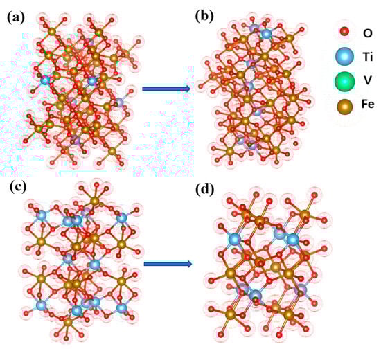 Schematic diagram of the lattice transformation of the main phases during the VTM oxidation roasting process: (a) TTM; (b) TTH; (c) FeTiO3 (d) Fe2TiO5.