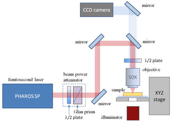 A regeneratively amplified femtosecond laser Pharos SP (Light Conversion Ltd. Vilnius, Lithuania) emitting pulses with a variable duration from 180 fs to 10 ps at an adjustable repetition rate up to 1 MHz at the wavelength of 1030 ± 2 nm was used as a source of laser light for micromodification of the studied samples. In the present study, the pulse duration was always set to 180 fs. The beam quality was characterized by M2 ~ 1.2. The laser beam was focused into the sample using an Olympus LCPLN50X-IR microscope objective (N.A. = 0.65) at a depth of 100 μm in the air, which gave an actual modification depth of about 0.19 mm due to the refraction of glass. The corresponding refractive index can be therefore roughly estimated as ~1.9. Under these conditions, the calculated beam waist diameter is approximately 1.2 µm. It should be mentioned that spherical aberration is considerable at this focusing depth, and the outermost parts of the beam were expected to be focused up to ~0.22 mm under the glass surface, though their impact in the modification is moderate because most of the Gaussian beam power is concentrated near the center of its cross-section. In this context, the calculated waist diameter should be regarded as a lower limit of the actual value. The sample was positioned by a 3-coordinate air-bearing motorized translation stage (Aerotech ABL 1000, Aerotech Inc., Pittsburgh, PA, USA) synchronized with the laser. A layout of the setup can be found in [24]. The laser-induced modification of the sample could be visually controlled in-situ by a Retiga 3000 charge-coupled device (CCD) camera (Teledyne QImaging, Surrey, BC, Canada). A simplified layout of the setup is shown in Figure 1.