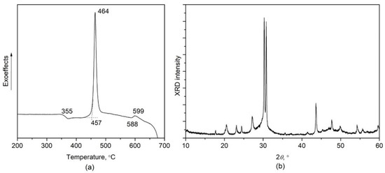 Figure 2a shows the DTA curve of the as-quenched glass under study. The glass transition temperature Tg, temperatures of the onset (Tx1), and the maximum (Tcr1) of the first exothermic peak are, respectively, 355 °C, 457 °C, and 464 °C. The second exothermic peak is characterized by Tx2 = 588 °C and Tcr2 = 599 °C and is much weaker than the first one. The determined values are somewhat higher than those reported for 5PbO∙3GeO2 glass by Lan, et al. [19] (Tg = 335 °C, Tx1 = 427 °C, Tcr1 = 427 °C, Tx1 = 481 °C, Tcr1 = 490 °C), and Sigaev, et al. [20] (Tg = 333 °C, Tcr1 = 427 °C, Tcr1 = ~520 °C). One piece of glass was heat-treated in the electric furnace at 460 °C for 1 h in order to study the crystalline phase precipitating at the first exothermal peak. The XRD pattern of this sample (Figure 2b) conforms well with the XRD pattern of the phase earlier reported to precipitate under heat-treatment at the temperature of the first exothermic peak in 5PbO∙3GeO2 glass [19] which was shown to be a metastable hexagonal crystalline phase transforming into ferroelectric Pb5Ge3O11 at higher temperature [17,18,19]. It was considered to be either Pb3Ge2O7 [17] or a metastable form of Pb5Ge3O11 [18,19]. The second exothermic peak was assigned to the transformation of the metastable phase to stable Pb5Ge3O11 [17,18,19,20]. It can be assumed that the increase of the characteristic temperatures relative to the earlier data indicates the shift of the chemical composition of glass to a lower content of PbO, which could be caused by the evaporation of Pb during melting. On this assumption, the linear extrapolation of the compositional dependence of Tg an Tcr1 in the range of 58–65 mol.% PbO [17] gives a rough estimation of the actual composition of synthesized glass as 53–54 mol.% PbO.