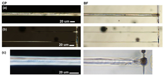 Bright-field (BF) and cross-polarized (CP) optical images of the top-view of the tracks written in lead germanate glass in two passes by the beam at the pulse energy, repetition rate and writing speed of, respectively: (a) 170 nJ, 250 kHz, 30 µm/s (1st pass) + 15 µm/s (2nd pass), (b) 60 nJ, 500 kHz, 30 µm/s (1st pass) + 20 µm/s (2nd pass, upper track) or 18 µm/s (2nd pass, lower track) (c) 250 nJ, 200 kHz, 30 µm/s (1st pass) + 20 µm/s (2nd pass).