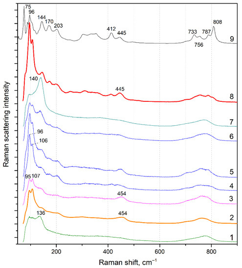 Nonpolarized Raman spectra of starting glass (1), glass heat-treated at 460 °C for 1 h (2), top (3), and bottom (4) crystallized areas of the cross-section of track I, crystallized area of the cross-section of track II (5), crystallized area of the cross-section of track III (6), top area of the of the cross-section of track III (7), glass heat-treated at 670 °C for 1 h (8), Raman spectrum of the polycrystalline Pb5Ge3O11 sample divided by the Bose–Einstein thermal factor presented by Sigaev, et al. [20] (9).