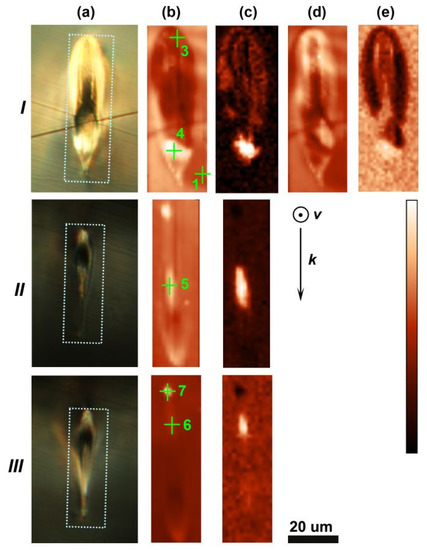 Cross-polarized optical images (a) and pseudo-color Raman maps (b–e) of the cross-sections of the tracks I, II, III: Brightness of the maps shows a peak value in the ranges 90–110 cm−1 (b) and 450–470 cm−1 (d), steepness of the spectral curve in the ranges 110–120 cm−1 (c) and 440–454 cm−1 (e); dotted frames show areas of Raman mapping; green crosses indicate points of acquisition of the Raman spectra with corresponding numbers given in Figure 4; k and v show, respectively, propagation and scanning directions of the writing laser beam; the scale bar is for optical images.
