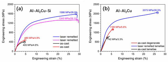 In this study, laser rapid solidification technique was used to refine the microstructure of ternary Al–Cu–Si and binary Al–Cu eutectic alloys to nanoscales. Micropillar compression testing was performed to measure the stress–strain response of the samples with characteristic microstructure in the melt pool regions. The laser-remelted Al–Al2Cu–Si ternary alloy was observed to reach the compressive strength of 1.59 GPa before failure at a strain of 28.5%, which is significantly better than the as-cast alloy with a maximum strength of 0.48 GPa at a failure strain of 4.8%. The laser-remelted Al–Cu binary alloy was observed to reach the compressive strength of 2.07 GPa before failure at a strain of 26.5%, which is significantly better than the as-cast alloy with maximum strength of 0.74 GPa at a failure strain of 3.3%. The enhanced compressive strength and improved compressive plasticity were interpreted in terms of microstructural refinement and hierarchical eutectic morphology.