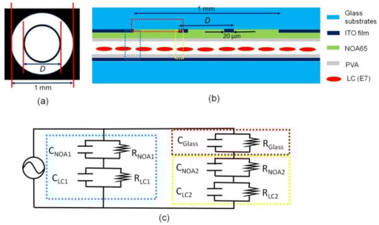 Figure 1 presents the cross-sectional scheme and top view of the CIFR–HPELCL with its equivalent resistor–capacitor (RC) electric circuit model. The lens consists of an LC layer and two indium tin oxide (ITO) conductive glass substrates of 1.1 mm thickness. The cell gap was controlled by Mylar spacers and filled with nematic E7 LCs (purchased from Daily Polymer, Ltd.) to achieve homogeneous cells with rubbed polyvinyl alcohol (PVA) films. The actual optically measured thickness of the LC was near 50 μm. Three CIFR ITO electrodes (D) with different diameters at the outside boundaries, namely, 240, 360 and 440 μm, were investigated. To prevent the occurrence of disclination lines, all the CIFR–HPELCLs were coated with an additional 82 μm thick Norland optical adhesive (NOA65, Thorlabs, Inc.) films on the hole-patterned ITO electrodes as dielectric layers [32,39]. The equivalent RC electric circuit model shown in Figure 1c was used to analyze the lens performance with the variation in the dimensions of the CIFR electrodes. The dimensions are represented by three major parts individually indicated by blue, red and yellow dotted rectangles in the figure. The dielectric constants (ε) and resistivity (ρ) of the materials at 1 kHz electric frequency are listed in Table 1 [1,40,41]. At 100 Hz electric frequency, these physical constants obtained through measurements are the same as those at 1 kHz, except for dielectric constant 6 for the NOA65 material.
