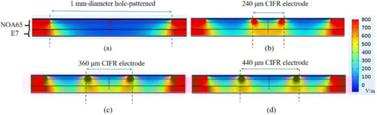 Figure 3 indicates the simulation comparisons of the electric field distributions in the two layers of NOA 65 and LCs in the HPELCL and the CIFR–HPELCL with dimensions of 240, 360 and 440 μm in diameter to drive the LC molecules via COMSOL Multiphysics. In the calculation, 10 Vrms was supplied across the hole-patterned and bottom planar electrodes, and the electric frequency was 100 Hz. The structure dimensions and their parameters were set up similarly to those in the CGlass simulation. The color bar shows the gradual decrease in the electric fields from red to blue.