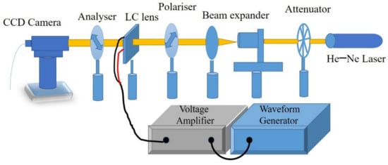 Figure 4 shows the experimental setup used to measure the interference patterns (i.e., pairs of black–white circles) of the LC lens under various electric voltages and frequencies [42]. A collimated He–Ne laser beam (λ = 632.8 nm) with an intensity controlled by an attenuator was passed through a spatial filter and a beam expander for purification. An expanded beam with a diameter of 35 mm was then achieved and used as the final incident beam of the LC lens. Two crossed polarizers (i.e., a polarizer and an analyzer) placed in the front and rear of the LC lens, respectively, were used to record the interference patterns in the LC lens. Both polarization directions of the polarizers were at a 45° angle to the rubbing directions of the LC alignment in the cell. A waveform generator (33220A, Agilent) was used to provide an AC electrical signal (i.e., a square waveform with 100 Hz frequency) that was amplified 20 times via a voltage amplifier (FLC Electronics AB, Broadband Linear Amplifier F20A) to connect the LC lens. In the end, a charge-coupled device (CCD) camera (DVC Company, 1500 M-00-CL) was used to record the interference pattern. The various AC voltages were connected to two terminals, namely, hole-patterned and the entire ITO electrodes, in the CIFR–HPELCL and the HPELCL.
