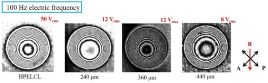Figure 5 shows the maximum pairs of concentric black–white interference patterns in the HPELCL and the CIFR–HPELCL with D radial dimensions operating at an electric frequency of 100 Hz with square waveforms. A pair of black–white concentric circular interference patterns indicates the 2π phase retardation in the radial direction. The total number of pairs is denoted as N. R in red is the rubbing direction, and A and P in black are the directions of the analyzer and the polarizer, respectively. The patterns resulted in pair numbers N = 12, 11, 14, 10 that correspond to the HPELCL and the CIFR–HPELCLs with CIFR electrode diameters of 240, 360 and 440 μm. Although the operation voltages of the HPELCL and the CIFR–HPELCLs increased due to the low electrical driving frequency (100 Hz), the operation voltages of the CIFR–HPELCLs were 12, 12 and 8 Vrms, which correspond to CIFR electrode diameters of 240, 360 and 440 μm, respectively. These values are lower than the operation voltage increase to 50 Vrms in the HPELCL.