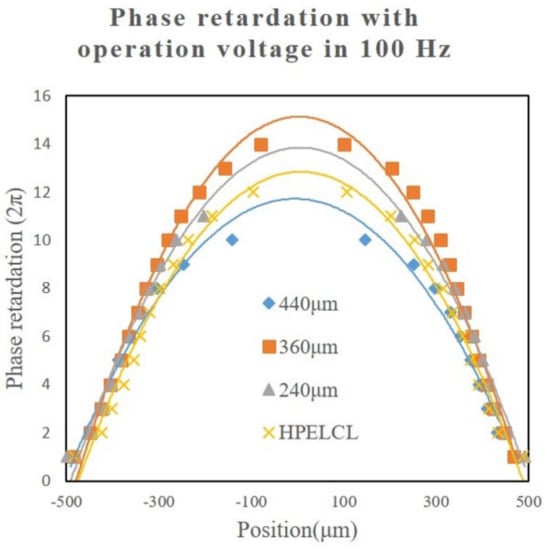 Radial phase retardation and curve fitting of the HPELCL and the CIFR–HPELCLs with the individual CIFR electrodes of different diameters (i.e., 240, 360 and 440 μm) under the electric frequency of 100 Hz with operation voltages.