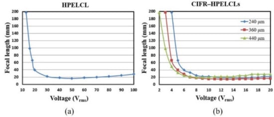 As shown in Figure 7a, the HPELCL shows the minimum foci, that is, 16.45 mm, at an operating voltage of 50 Vrms. The fabricated CIFR–HPELCLs also possessed the minimum foci, namely, 17.95, 14.10 and 19.74 mm in the 240, 360 and 440 μm CIFR electrodes at 12, 12 and 8 Vrms operation voltages, respectively. These findings can be attributed to the embedded CIFR electrode that enhanced the fringe field and reduced the operation voltage, as shown in Figure 7b.