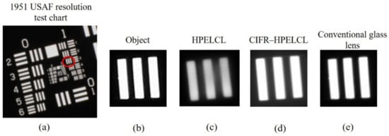 The distance between the LC lens and the object was 65 mm, and a polarizer was placed between the LC lens and the object with a transmission axis parallel to the rubbing direction of the LC cell. The images were recorded using a CCD camera (DVC Company, 1500M-00-CL), which was placed behind the LC lens. Figure 8b presents the straight pattern image of a part of the 1951 USAF resolution test chart recorded by the CCD without an LC lens. Then, the LC lens was placed in front of the object and operated at the minimum foci under 100 Hz electric frequency. Figure 8c,d shows the straight pattern recorded by the CCD camera via the HPELCL at 50 Vrms and the CIFR–HPELCL with a 360 μm CIFR electrode at 12 Vrms, respectively. The image captured via a conventional glass lens with a 30 mm focal length as a reference is shown in Figure 8e.