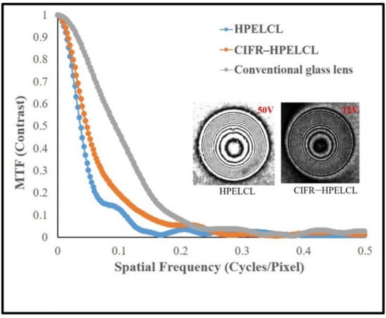 Modulation transfer functions (MTFs) of the fabricated HPELCL, the CIFR–HPELCL with a 360 μm CIFR electrode under the 100 Hz electric frequency and the conventional glass lens.