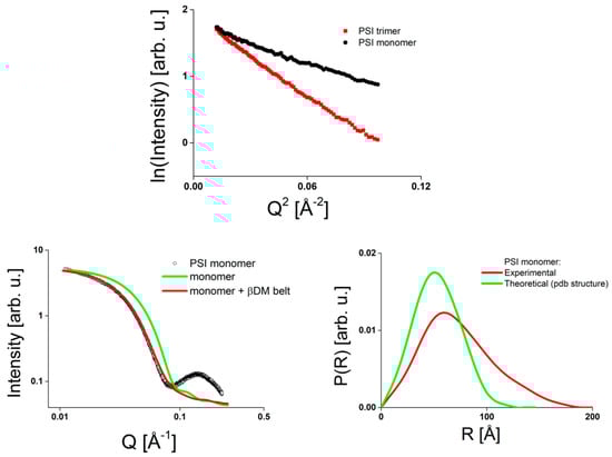 As an example, SAXS data of monomeric and trimeric photosystem I (PSI) of T. elongatus are shown in Figure 2 (data taken from Golub et al. [62]). The data obtained in the region of small scattering vectors q are depicted in the upper panel of Figure 2 in the form of a Guinier plot. Both forms of PSI reveal a linear behavior as expected in the absence of aggregation but exhibit different slopes corresponding to radii of gyration of 58 and 78 Å in the cases of monomeric and trimeric PSI, respectively. That is, similar to the case of PC discussed above, the oligomerization state of PSI can be investigated by SAXS.
