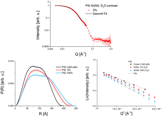 (Upper) panel: SANS data of the PSI–βDM complex at a contrast of 5%. Data are taken from Kölsch et al., 2020 [15]. (Lower left) panel: Pair distance distribution function P(R) of the PSI–βDM complex in 5% D2O (red line) and 100% D2O (blue line). For comparison, the P(R) function corresponding to the crystal structure of PSI (pdb code 1jb0 [10]) is also shown. (Lower right) panel: Guinier plots of the PSI–βDM complex. Color code is the same as in the left panel.