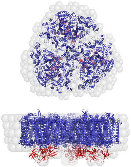 In the two lower panels of Figure 6, the solution structure obtained using Dammif is compared with a model comprising the crystal structure of trimeric PSI and a simulated monolayer of detergent molecules. Assuming the closest packing of detergent molecules, the simulation yields a value of 1530 (170 rows with 9 βDM molecules in a row) βDM molecules bound in the PSI–detergent complex. This finding is in general agreement with our earlier SAXS data [62] and with previous studies on protein–detergent interactions, which typically reveal a ring-like monolayer of detergent molecules bound to membrane proteins [16,72,73,74].