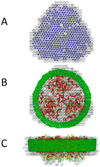 Panel (A): Comparison of the ab initio reconstructions of the solution structures of PSI from SANS data with detergent match at 5% D2O taken from Figure 3 (blue dots) and of the PSI–detergent complex from SANS data without detergent match at 100% D2O (grey spheres, for easy of inspection spheres are shown with 80% transparency). Panels (B,C) Top view (B) and lateral view (C) of the crystal structure of PSI (pdb code 1jb0 [10]) and the solution structure (grey spheres) produced by Dammif based on the SANS data of the PSI–detergent complex at a contrast of 100% D2O. The difference can be accounted for by a monolayer of detergent molecules (see green structures).