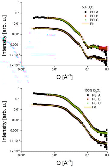 The solution structure of the whole PSI–βDM complex was investigated by SANS experiments using a contrast of 100% D2O (see Figure 5). Before we proceed with the solution structure of the PSI–detergent complex determined from the SANS data, we recall that our earlier SAXS data [62] indicated the presence of free detergent micelles in the preparation, which were visible as a distinct peak at about 0.17 Å−1 corresponding to a small spherical particle with an average size of only about 35–40 Å. The latter peak is not separately visible in the SANS data presented here but had to be considered in a simultaneous analysis of PSII SANS and SAXS data [63]. In analogy, we use the shape of free detergent micelles derived from SAXS data before [62] to fit the SANS data of the PSI–detergent complex in this study (Figure 5).