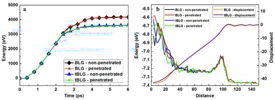The advantage of graphene serving as armor material is its excellent performance in energy delocalization [17,19]. Therefore, we were particularly interested in the energy propagation process in tBLG and BLG. Figure 2a is the energy absorbed by the first graphene layer in both penetrated and non-penetrated cases for BLG and tBLG, respectively. In the end, the first graphene layer in tBLG absorbed less energy, owing to its earlier fracture. However, there was little difference between BLG and tBLG before the fracture of the first graphene layer as well as between the penetrated and non-penetrated cases. It seemed strange that the tBLG performed worse in terms of energy absorption yet possessed a lower penetration probability. Figure 2b is the energy and out-of-plane displacement profile of the second graphene layer at t = 3.0 ps. The profile is illustrated along the line that goes through the impact center parallel to the armchair direction of the second graphene layer. The comparison of the energy curves and displacement curves in Figure 2b indicates that the energy was mostly transferred through a cone wave rather than an elastic wave. The propagation speeds of cone wave, which also represents the dissipation speeds of energy along a longitudinal direction, for BLG and tBLG, in both penetrated and non-penetrated cases, were nearly identical. The energy profile along the zigzag direction can be seen in Figure S2 in the supplementary material. Moreover, the phonon density of state also showed a significant similarity between BLG and tBLG, which means an equivalent energy dissipation speed in terms of atomic vibration between BLG and tBLG. Above all, tBLG showed neither advantage nor a disadvantage in energy delocalization. Namely, by twisting a certain angle between two sheets of graphene, it did not lose its superiority in the energy-delocalization property.