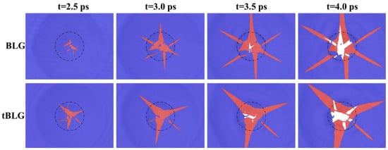 Considering that both cracks and fragments can be expressed by the in-plane perimeter of atoms, chaos degree could be helpful to explore the failure mechanism. The results are shown in Figure 4, and the data in each time point were averaged over all the simulations that belong to the same case. The dramatic increase of the chaos degree at around 2 ps was caused by the fracture of the first layer. The subsequent decrease was caused by the petals and fragments moving out from the impact region. Because of the earlier fracture of the first layer, the increase and decrease of the chaos degree for tBLG were both earlier than that for BLG.