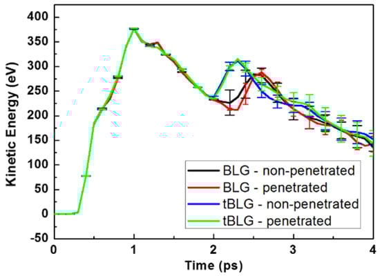 The total kinetic energy of atoms within the impact region is shown in Figure 5. The data were averaged over all the simulations that belong to the same case. All the curves exhibited two main peaks. Before the first peak, the atoms were sped up by the bullet consecutively until they reach the same speed as the bullet. Then the atoms started to slow down owing to the reduction of the speed of the bullet. When the first graphene layer fractured, the stored strain energy was released and transformed into the kinetic energy of the petals and fragments, resulting in the formation of the second peak in the curves.