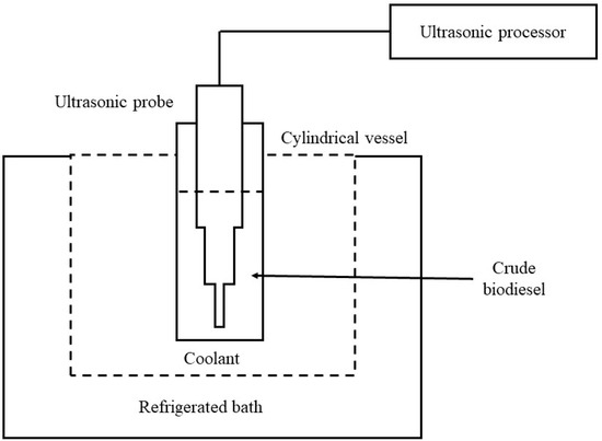 The system was designed based on the crystallization process. Temperature is vital for crystallization to occur. In this study, a lower temperature was considered. The system consisted of a refrigerated bath unit, a cylindrical vessel, and an ultrasonic unit, as illustrated in Figure 1. This system was suitable for enhancing the crystallization process. The system was developed in the laboratory-scale prototype as a cooling unit using a refrigerated bath circulator (630D, PROTECH, Shah Alam, Malaysia). Crude biodiesel was poured into the vessel attached inside the refrigerated bath. The vessel was made out of stainless steel, which possesses high corrosion resistance and good heat conductivity.
