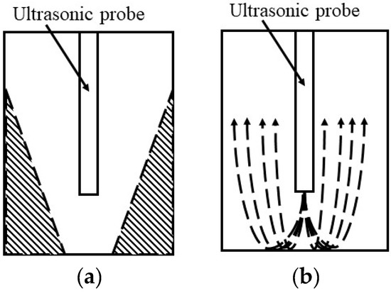 The ultrasonic wave was used to stir the sample inside the vessel and conical-shaped solids were obtained after the process was completed. The impurities solidified, as illustrated in Figure 2a, where solids formed on the vessel surface. Figure 2b shows the ultrasonic wave direction. The ultrasonic wave hits the bottom of the vessel and then moves upward. The process was repeated continuously according to the desired crystallization time.
