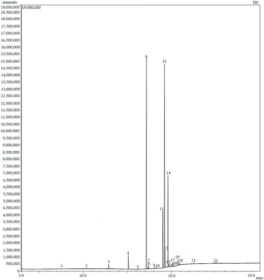 In the table, the information concerning the correction area of individual components and the sum of the correction area is provided and thus the percentage composition of individual FAME could be calculated using Equation (1). These data can be obtained from Table 3. For Peak 3, Lauric: