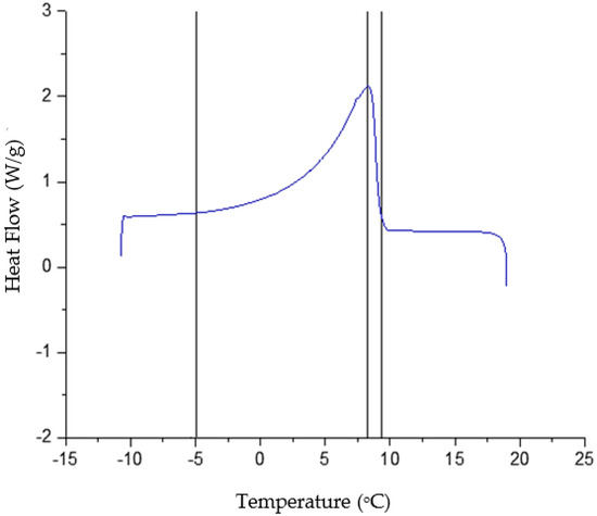 Before the purification of the biodiesel via SAC, it was possible to measure the material’s response to heating or cooling using thermal analysis (TA). In Figure 5, the graph of temperature (°C) against heat flow (W/g) was generated via DSC. The sample was cooled from 20 °C to −11 °C. One exothermic peak was observed from the graph, indicating the crystallization peak. The onset temperature at 9 °C refers to the starting point of crystallization, the peak temperature of 8 °C represents the highest reaction rate, and its endset temperature occurred around −5 °C. The onset temperature refers to when the crystallization of biodiesel starts to occur, whereas peak temperature and endset temperature refer to the temperature at the highest reaction rate and the temperature where the process ends, respectively [13]. The crystallization point of biodiesel from the analysis was used to determine the temperature range for the subsequent part of the experiment using the SAC method.