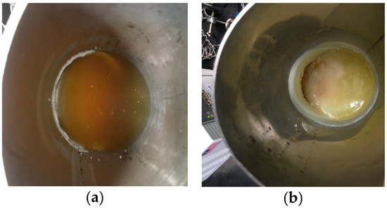 (a) Pure biodiesel remained in the liquid phase and (b) solidified glycerol attached to the vessel surface.