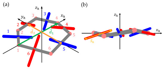 As seen from Figure 2, in the coordinate system centered on the hexagon points along the axis, while points along the axis. Thus, we can obtain the rotation matrix , which acts on the unit vector to transform it into in the following way: