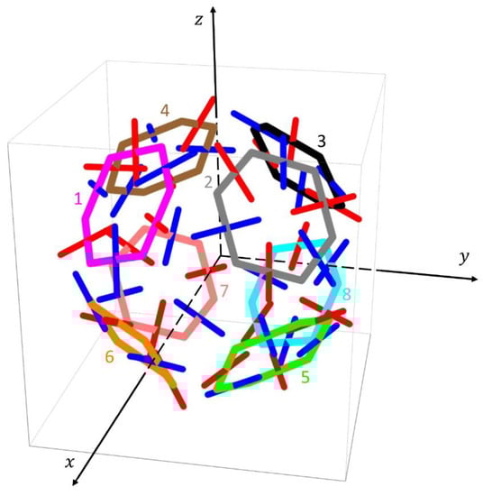 Hexagons in the unit cell of the chiral cubic phase in the laboratory system. Red and blue lines represent different inclinations of anisotropic scatterers with respect to the hexagon sides. All hexagons are identical (see Figure 2); they differ only by location and orientation inside the unit cell.