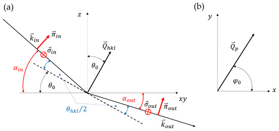Scattering geometry for the peak with Miller indices () in the laboratory system. (a) is the scattering vector, and are the wave vectors of the incident and scattered wave, respectively; and are in-plane components of polarization of the incident and scattered wave, respectively, and and are perpendicular components. is the angle between the scattering vector and the axis and is the scattering angle. The angles between the wave vectors of the incident and scattered wave and the plane are and , respectively. (b) Projection of the scattering vector on the plane ( ) forms an angle with the axis.
