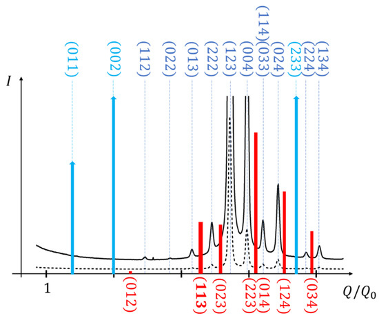 Intensities (in arbitrary units) of the diffracted peaks, measured by the nonresonant X-ray scattering (black curve) [11] and the predicted resonant (red lines) and resonantly enhanced peaks (blue arrows) as a function of the normalized scattering vector magnitude (), defined by the Miller indices : . The measured and calculated intensities are not to scale. The intensities are calculated at the scatterers’ inclination .