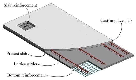 In order to investigate the mechanical behavior of composite slabs, a number of experimental studies [1,2,3,4,5] have been provided for the flexural bearing capacity, shear strength, bonding assessment and interface behaviors of precast planks without reinforcement crossing the interface. Meanwhile, the existence of latticed girder resists the interface shear force and avoids slippage, delamination and debonding at the interface. Some experimental studies have been conducted on the mechanical behavior of LGCS. Du et al. [6] provided an experimental work on the flexural bearing capacity of lattice girder composite slabs. Newell and Goggins [7] carried out experiments of the lattice girder composite slabs at construction stage and examined the key parameters which influence their behavior at both serviceability and ultimate bearing limit states.