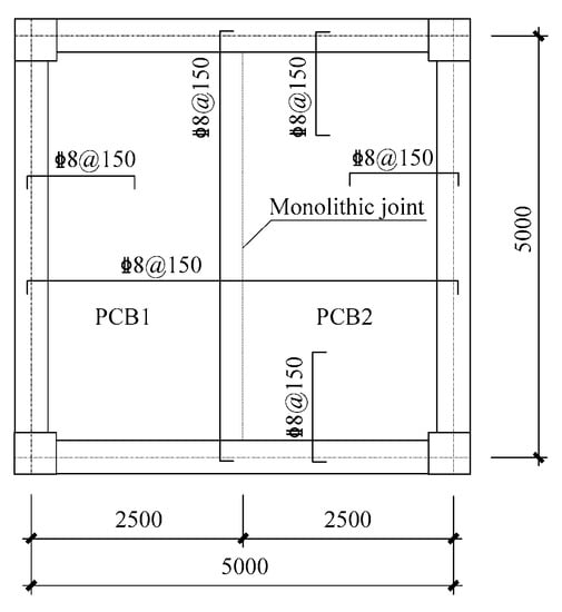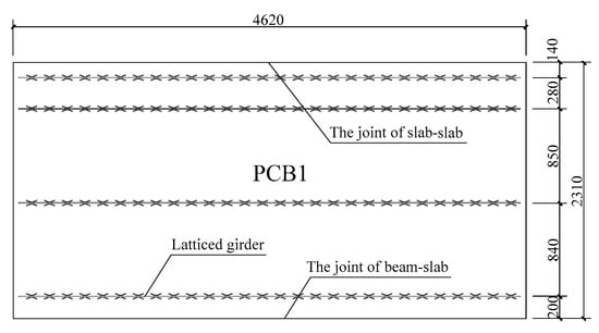 The thickness of precast bottom plank is chosen as 60 mm, and the thickness of the cast-in-place top plank is 80 mm [16]. The beams and columns are cast-in-place, where the strength of precast bottom plank and cast-in-place top plank are both C30 and the steel bars are all made of HRB400. The reinforcement in these two precast planks is C 8 at 150 mm (C 8@150) spacing in both the longitudinal and transverse directions and the concrete cover to the reinforcement at the plank bottom surface is 25 mm. Reinforcement is settled near the support as C 8 at 150 mm (C 8@150). It is shown in Figure 3, four latticed girders are settled in one precast bottom plank (PCB1). The first lattice girder is placed 140 mm from the joint, which is equal to thickness of the slab. The second lattice girder placed 280 mm from the first lattice girder. These two lattice girders are arranged to strengthen the joint. A lattice girder is settled in the middle region of the precast plank at intervals of 850 mm from the second lattice girder. The last lattice girder is placed 200 mm from the joint to the beam to enhance the beam–slab connection.