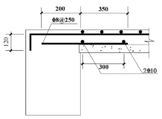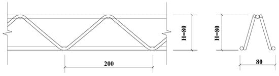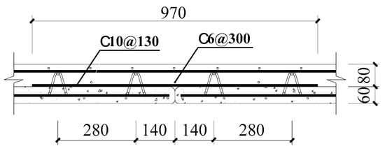 The configuration of latticed girder is illustrated in Figure 4. The detailed latticed girder and monolithic joint are shown in Figure 5. In order to further enhance the resistance of the slab near monolithic joint, additional reinforcement with C 10@130 is arranged along the joint. The length of the additional reinforcement is 970 mm (Figure 5). As shown in Figure 6, reinforcement near the support is installed to strengthen the connection between slab and beam. The length of the support reinforcement is 120 mm. It is emphasized that the design parameters, such as size, thickness and reinforcement of the slab, are strictly followed “Code for Design of Concrete Structures (GB50010-2010) [17]” and “Technical Specification for Application of Lattice Girder Slab (T/CECS 715-2020) [16]”.