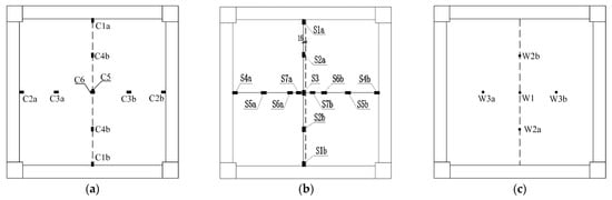 In order to investigate the strain condition of different components in the LGCS, electrical resistance (ER) strain gauges are bonded to the longitudinal reinforcement and the concrete surface of the slab. The arrangement of strain measuring point of concrete is illustrated in Figure 7a. It can be seen in Figure 7a that C1a and C1b are symmetrically arranged. In the experiment, the strain is calculated as the mean value of C1a and C1b, the remaining strain measuring points are the same. Since lattice girder and longitudinal reinforcement are both set in the slab, the strain distribution is much complex than that of cast-in-place slab. We apply 13 strain measuring point of bottom slab longitudinal reinforcement depicted in Figure 7b, and the final strain is also calculated as the mean value of S1a and S1b. With regard to the adopted instrumentation, five linear variable differential transformers in Figure 7c are applied to measure the vertical displacement at midspan, in the middle of each precast plank and at edge of the bottom slab. With regard to the adopted instrumentation, five linear variable differential transformers in Figure 7c are applied to measure the vertical displacement at midspan, in the middle of each precast plank and at edge of the bottom slab.