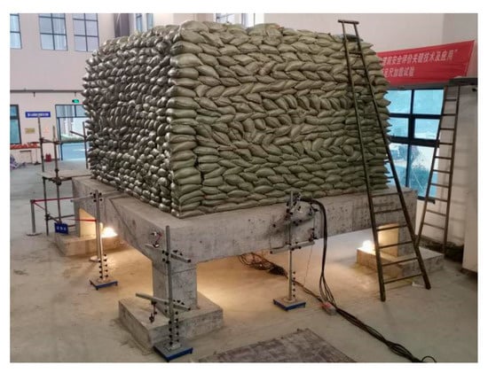 The loading scheme is carried out with reference to the “Chinese Standard for Testing Methods of Concrete Structures (GB/T 50152-2012) [18]”. A uniformly distributed load is applied by pile loading of sandbags in Figure 8. The serviceability limit state is calculated as 8.4 kN/m2 and the bearing capacity limit state is calculated as 16.4 kN/m2 [17]. In order to investigate the ultimate bearing capacity of the composite slab in this study, the maximum value of the uniformly distributed load is chosen as 40 kN/m2, which is corresponding to 2.5 times of the value of ultimate bearing capacity of the slab. Before the maximum distributed load (40 kN/m2), the loading procedure (including the weight of the slab and pile loading) is applied progressively by steps, and for each step the load is 2.0 kN/m2. When the sandbags are piled up, they are distributed evenly to avoid arch effect. It should be noted that for each loading step, sandbags are evenly piled to the slab by forklift. After each loading step, the load should be kept for 15 min until the measured stress, strain and deflection are stable.