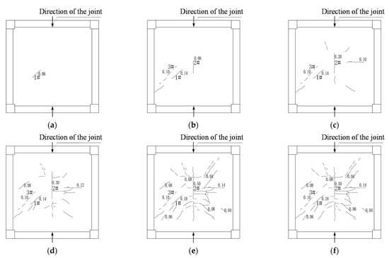 Cracking distribution of bottom plank at different loading stages: (a) Crack distribution at load q = 10 kN/m2; (b) Crack distribution at load q = 16 kN/m2; (c) Crack distribution at load q = 22 kN/m2; (d) Crack distribution at load q = 28 kN/m2; (e) Crack distribution at load q = 34 kN/m2; (f) Crack distribution at load q = 40 kN/m2.