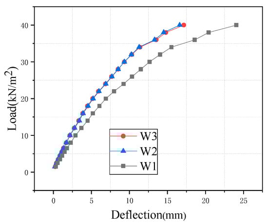 Before the distributed load of composite plate reaches 10 kN/m2, the deflection increases linearly with the load. The lattice girder slab is a hybrid system and, therefore, its initial stiffness is due to the composite action between the lattice girders, concrete and reinforcement. When cracking in the concrete plank progressively occurs, there is a load redistribution and stiffness degradation. At this stage, the strength of concrete decreases and the stiffness of the slab is primarily provided by the lattice girder and the reinforcement. When loaded to the ultimate state at 40 kN/m2, the midspan deflection of the bottom slab reaches 24.07 mm, which is about 1/208 of the span of the slab. However, the deflection is far below the limit of the maximum deflection (1/50 of the span of the slab) according to the Code for Design of Concrete Structures (GB50010-2010) [17]. The load–deflection curve of the latticed girder composite slab is depicted in Figure 10. In this figure, W1 curve represents the load–deflection curve of the midspan from measuring point W1 in Figure 7. W2 and W3 curves represent the mean load–deflection curves of W2a and W2b, W3a and W3b, respectively. In this test, the deflections of x direction and y direction are basically the same in the whole process, indicating that the LGCS has compatible deformation capability. Under the uniformly distributed load, the vertical deformation of the slab is similar to that of the traditional concrete two-way slab.