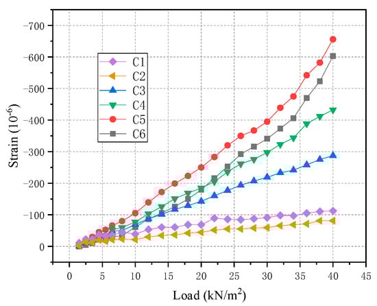 According to the ER strain gauges at the bottom plank of concrete, the strain distribution of the concrete can be recorded. It can be seen from Figure 11 that the tensile strain of concrete which parallels to the joint is greater than that in the vertical direction after reaches 7.5 kN/m2, which indicates that the slab presents a certain mechanical characteristic of orthogonal anisotropic due to the existence of monolithic joint.