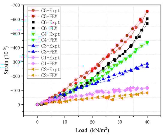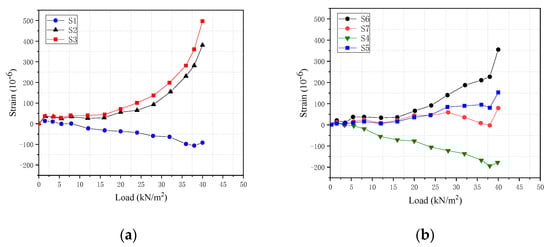 Figure 12a,b show the load–strain curves of bottom longitudinal reinforcement which are parallel and vertical to monolithic joint, respectively. As for the reinforcement parallel to the joint, it can be seen from that the reinforcement strain is small before loading to 16 kN/m2. After being loaded to 16 kN/m2, the strains from all measuring points paralleled to joint increases progressively, and their value exceed that of vertical to joint. The maximum strain value appears in the midspan. As for the reinforcement vertical to the joint, similar strain distribution can also be observed. The load–strain curves of the vertical longitudinal reinforcement are more irregular when comparing with that of paralleled longitudinal reinforcement, probably due to the existence of the joint which cuts off the steel bars and brings the discontinuities.