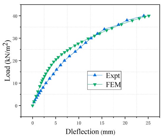 Figure 14 demonstrates the simulation results of load–strain curves concrete at bottom plank. As shown, the numerical curves are compared to the experimental results, where numerical results show satisfactory accuracy within the band corresponding to the experimental results, verifying the reliability of the proposed numerical model. The detailed comparison between numerical and experimental results are given in Table 2. As proposed in Table 2, the maximum error is 7.6%, which further indicates accurate simulation results. The midspan load–deflection curve of the composite slab shows the deformation development under the load. Figure 15 demonstrates the comparison between the simulation results and the test results of the load–deflection curve of the mid-span of the composite slab. The simulated maximum deflection of the midspan is 25.13 mm, and the experimental maximum deflection is 24.07 mm. The result is in agreement with the experimental result, which testify correctness and effectiveness of the proposed numerical model.
