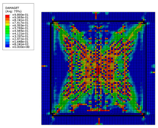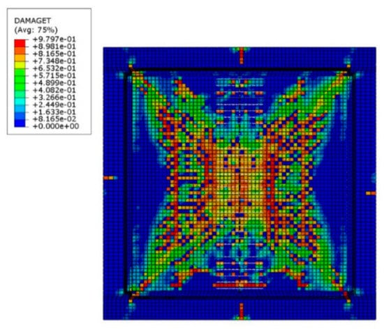 The comparison of load–deflection curves is given in Figure 18. It can be seen in this figure that M1 and M2 curves are similar. As for M2, the maximum deflection is 26.41 mm, which increases 5.1% compared to the deflection of M1. It is implied that the existence of the additional reinforcement has only slight influence on the resistance and stiffness of the slab. However, the additional reinforcement plays a part in preventing the cracks near joint. Tensile damage distribution of M2 is shown in Figure 19 that the maximum value is bigger than M1 given in Figure 17b. Furthermore, the damage of M2 near the joint is severer than M1 (Figure 17b) with the absence of additional reinforcement.