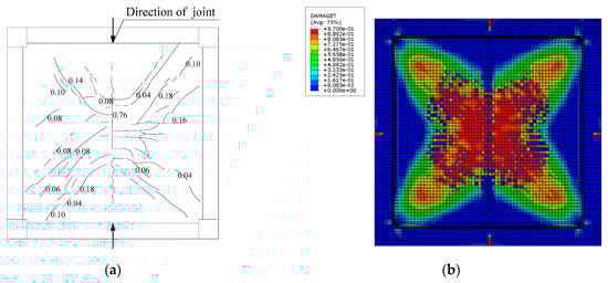 The interface between precast and cast-in-place concrete is the weak zone of the composite slab. The bonding in this interface is mainly provided by the chemical adhesive force, interfacial friction, mechanical interaction and the resistance brought by lattice girder, which contains complex mechanisms. Observing the concrete damage at this interface is conducive to determining whether full composite action up to the ultimate loading capacity without interface failure can be achieved. The bottom surface of the precast plank is also intriguing in the simulation that the cracks at bottom surface might induce the leaks and the reinforcement corrosion. Since the cracks in the concrete is usually brought by the tension, the tensile damage of the interface and bottom surface are shown in Figure 16 and Figure 17b. As demonstrated in Figure 16 and Figure 17b, the tensile damage distribution reveals a typical crack pattern of the two-way slab. However, it can be seen from Figure 16 that the damage value is relatively small in the region where additional reinforcement is settled near the joint. This numerical result in Figure 17b is correspondent to the experimental crack pattern depicted in Figure 9 (Figure 17a).
