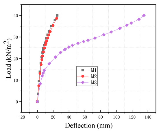 As for M3, the shape of load–deflection curve and maximum deflection in Figure 18 are significantly different from M1 and M2, which indicate a much lower stiffness of the slab without the lattice girder. The maximum deflection of M3 reaches 134.90 mm (1/37 of the span of the slab), almost 5 times that of M1, which exceeds the limit of the maximum deflection (1/50 of the span of the slab) according to the Code for Design of Concrete Structures (GB50010-2010) [17]. Therefore, the existence of the lattice girder plays an essential role in the mechanical behavior of the slab.