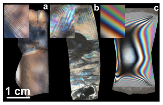 Polarized light microstructure images of as-grown crystals: (a) 9ScSZ, (b) 9Sc0.5YbSZ, and (c) 9Sc1YbSZ.