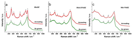 Raman spectra of as-grown and as-annealed (a) 9ScSZ, (b) 9Sc0.5YbSZ, and (c) 9Sc1YbSZ crystals.