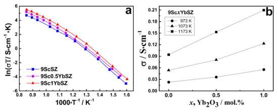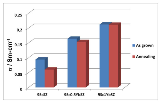 As can be seen from Figure 3, the 9ScSZ crystals stabilized only with scandia have the lowest conductivity in the whole test temperature range. Co-doping of the crystals with 0.5 mol.% Yb2O3 increases the ionic conductivity. Phase composition analysis showed that the as-grown 9Sc0.5YbSZ crystals contain the cubic phase along with the tetragonal phase and therefore their conductivity in the entire temperature range is higher than that of the tetragonal 9ScSZ crystals. The single-phase 9Sc1YbSZ crystals that contain the tʺ phase have the highest conductivity.