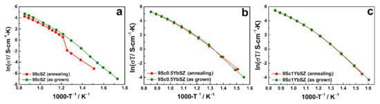 Conductivity of as-grown and as-annealed (a) 9ScSZ, (b) 9Sc0.5YbSZ, and (c) 9Sc1YbSZ crystals as a function of temperature.